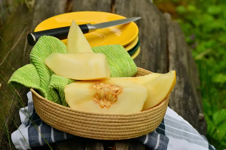 Un melón es una fruta suntuosa. Hermoso y delicadamente dibujado por fuera, un melón maduro no mayor que una naranja puede llenar todo un salón con su fragancia. Por dentro, fresco y lleno de zumo, se ofrece para apagar la sed y nos obsequia con una sensación delicada, como la de comer nieve. Los árabes dicen que en los melones hay una bendición: «Quien se llena el vientre de melones, se llena de luz. » La dulzura de los melones, acanalados y decorados con dibujos como de encajes, fue uno de los aportes que hicieron a España los moros, que a su vez los habían recibido de Persia o del corazón de Africa, ya que tanto Oriente Medio como Afric